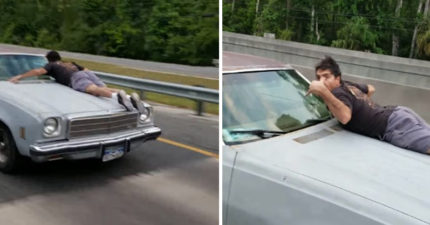 男子趴在高速移動車子  「一個手勢」司機秒懂:他老婆被偷了!