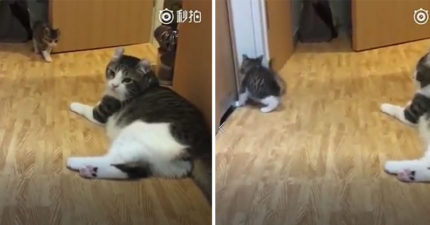 冏慘!菜鳥貓想嚇老貓 下秒自己變「丟臉小蠢蛋」:啊啊沒事~我經過而已