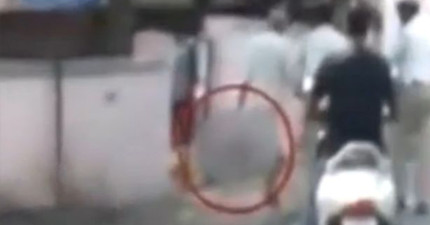 印度監視攝影機拍到男子失神在馬路上亂晃,而他手裡的頭顱讓所有路人都嚇傻了。