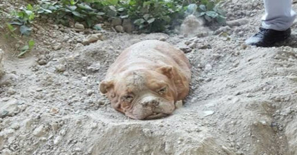 有人在散步的時候發現這隻奄奄一息的狗狗在土裡,靠近之後才發現這悲劇…