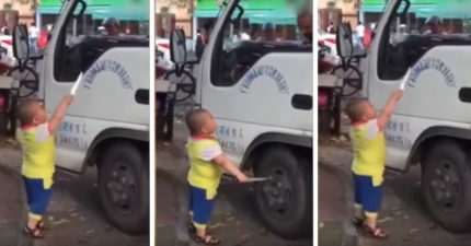 小男童拿著刀威脅卡車上的司機「還想把輪胎戳破」,旁邊路人覺得好笑繼續拍。