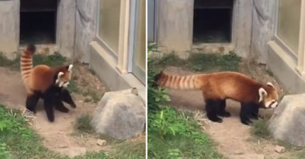 紅熊貓踏出家門「被小石頭嚇壞」 雙腳一顛站著走遊客傻眼:有工讀生?