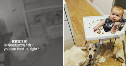 影/2隻傻阿金錯把「寶寶掉食物當餵食」 6點準時叫小主人:快點餵我們啦~