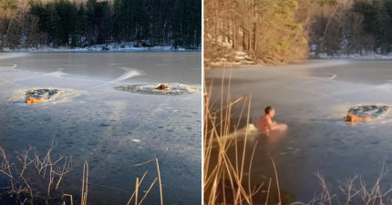 看見落水狗暖男「跳冰湖」搶救 下秒「愛犬跟著一起跳」女主人崩潰:牠還很興奮…