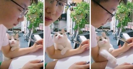多看我幾眼嘛!圓臉貓頭掛哥哥手臂 小手手亂揮:別畫了~