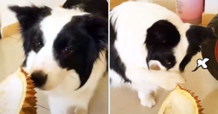 主人把榴槤拿給狗狗聞 他大退3步遮鼻子:想毒害本汪身心健康?