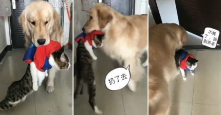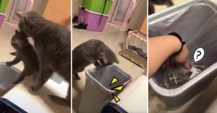 照顧你真累!貓媽媽把小喵丟垃圾桶 還回頭確認一下:嗯有丟準