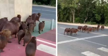 影/走斑馬線才安全!水豚家族「扭屁屁過馬路」路人全被萌翻❤