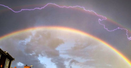 閃電劈入雙彩虹!攝影師捕捉「雷神跑過彩虹橋」的罕見奇景