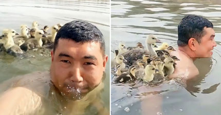 超暖奶爸「教小鴨游泳」自願犧牲 黃色毛球「狂搭便車」