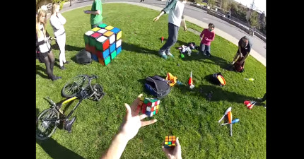 看到他拋接魔術方塊看起來不怎樣,但沒想到他居然在一邊拋一邊解開魔術方塊!