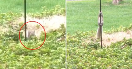松鼠想偷吃鳥食!卻每爬竿必滑落 爬到一臉問號:我喪失功力了?