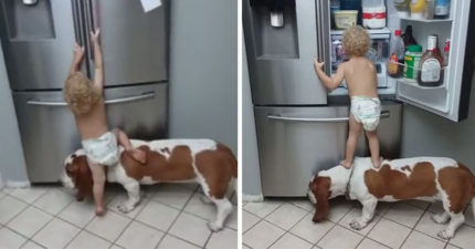 貪吃小主人「拉狗狗當腳踏墊」偷翻冰箱!下一秒「狗狗超爆笑背叛」萌翻百萬人!(影片)