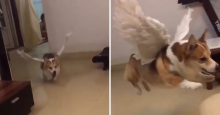 短腿柯基戴翅膀直接變身 一個跳躍「最萌天使飛高高」:I can fly~