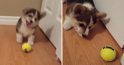 柯基頭一次見到球球超興奮 亂跳瞎忙「完全沒碰到球」:快開始滾呀!