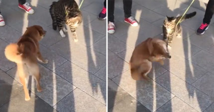 傻瓜柴好奇貓貓被牽住 靠近示好「慘被巴到懷疑狗生」:偶做錯了什麼QQ