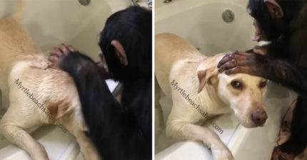 黑猩猩暖心「幫汪朋友洗香香」 超專業手法狗狗一臉舒服:再多抓兩下!