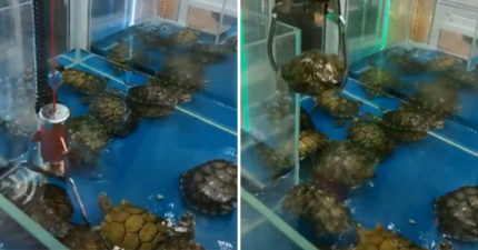 娃娃機狠夾活烏龜「垂直空投」 嚇到龜縮無力任人擺佈