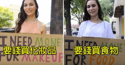 美女分別打扮成「正妹要錢買化妝品」和「落魄女要錢買食物」,路人的選擇讓我看到人性可能真的沒救了…