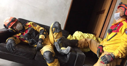 花蓮救難人員被拍到累癱「站著靠牆睡」讓網友心酸:救災英雄謝謝!