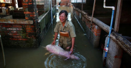 這是河北淹水後一間養殖場的悲慘照片,這名女子抓著淹死的豬大哭。雖然救活1000隻但…