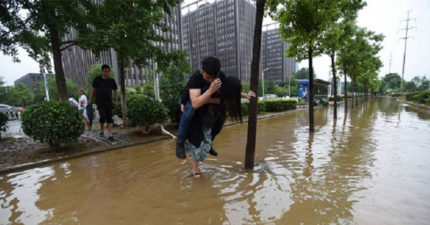 男友因為鞋子太名貴不想弄髒,當然就只好讓女友背他走過淹滿水的道路。