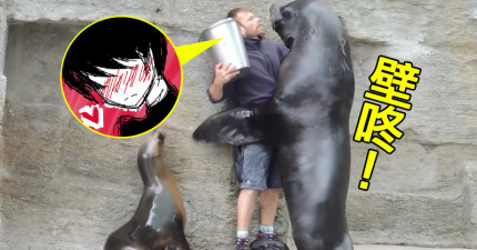 這隻海獅看到食物竟然就直接來硬的「壁咚」飼育員,而他的反應一樣也讓人超害羞!