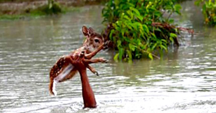 河水暴漲!印度男孩無懼自己被滅頂 始終「堅持舉著小鹿」