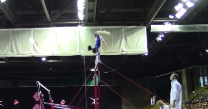這位體操女選手在單槓上因為失誤而墜地,但教練的神反應讓觀眾都開始鼓掌!
