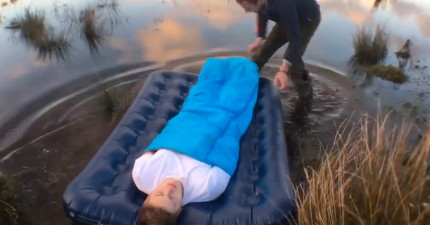 他们趁朋友熟睡时「把他的床整个拉到湖水中」,他醒来时的爆炸反应让我笑到觉得有点对不起他…