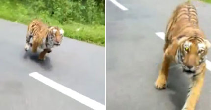 影/超毛!騎車時「路邊衝出大老虎」拔腿直追 騎士「差點被吃」超驚險畫面曝光