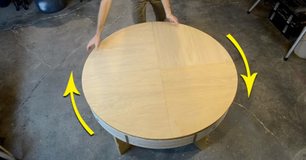 他先扶著這張看起來很普通的木桌,但他旋轉桌面開始變形後你就會發現「家裡再多生幾個都夠用」!