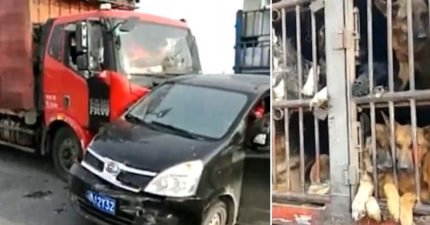 爱狗人士驾车勇挡「送上百只狗去屠宰」卡车,卡车不管阻碍全力冲刺…