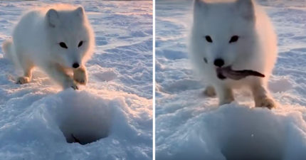 影/连战斗民族都没辄!冰钓遇小白狐「挖冰求鱼」 臭屁脸叼走:拿来就对了啦~