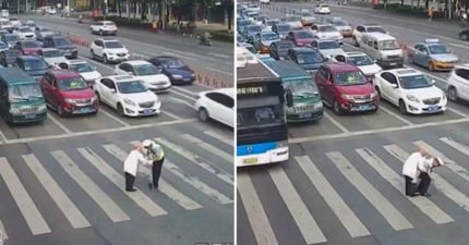 老爺爺拄拐杖過馬路 上百車準備飆綠燈「暖警屈膝:上來吧!」