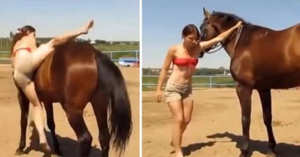 正妹跳馬背失敗到想哭 帥氣馬兒都看不下去「屈膝貼地」果然靈性超強