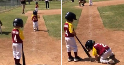 3歲幼幼棒球員「超慢動作跑壘」 45秒「跪地搶壘包」萌到融化❤
