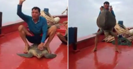 海龜被漁夫「整個人坐在背上當馬騎」 不斷揮動前肢掙扎他卻開心歡呼!