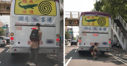 洋男玩命「踩滑板拉公車滑行1.5公里」穿梭車陣,被抓到恐GG…網友譏:節能減碳你我做起!(影片)