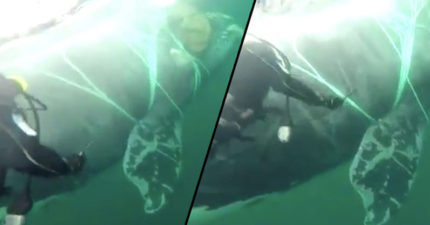 影/4公尺鯨魚「被魚網纏住」痛苦掙扎 智利海軍拿刀救援:網子為何不帶走?