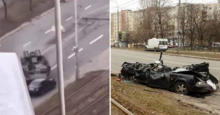 影/駕駛還在車上!俄坦克「突轉彎輾扁轎車」駭人畫面曝