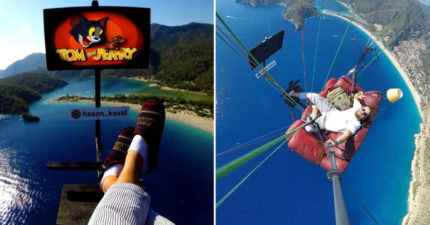 狂男挑戰「把整個客廳」帶去跳傘 在高空「換拖鞋」爽看電視