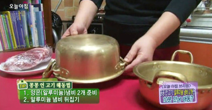 她準備要教大家「讓冷凍的肉在10分鐘內迅速退冰」的驚奇廚房妙招!