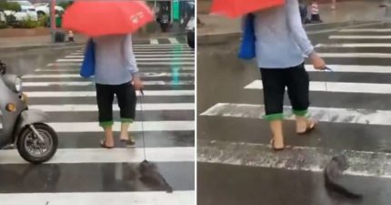 阿北雨天遛寵物「貼地滑溜扭動」 路人近看牽繩尾端傻眼