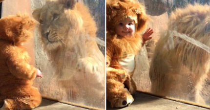 影/11月大嬰兒穿獅子裝「隔玻璃擊掌」玩耍 獅子以為是孩子一起跳高高啦~