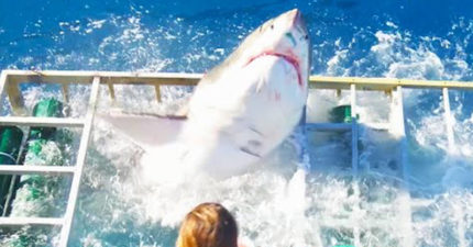 暴走的大白鯊「衝進了鐵籠子」裡,而且裡面竟然還有觀光客在…