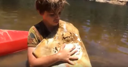 12歲小男生抓到了野生刺魟把牠抱起來差點被尖刺刺中,但下一秒就出現了最可愛的驚喜!