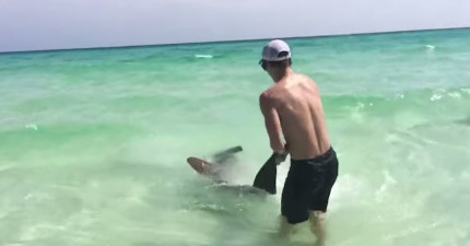 這位小帥哥貌似在徒手跟鯊魚搏鬥,但背後真正的原因讓人想為他鼓掌!