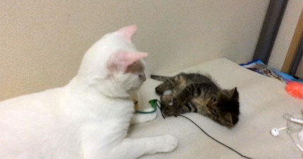 白色貓咪本來會一直逗小隻的,但當開始地震時,大隻的反應讓我太感動了!