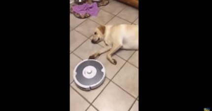 通常寵物一看到吸塵器就會立刻逃開…但這隻狗狗怎麼這麼奇怪?!